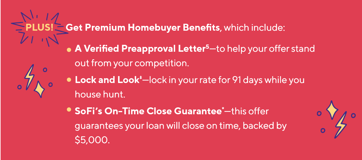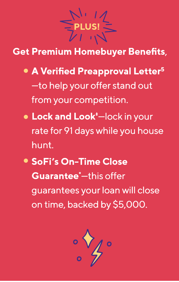 Thinking about buying a home? This is a job for—a SoFi Home Loan. | | | | The advantages of a SoFi Home Loan include: | | | | | • | Down payments as little as 3% for first-time homebuyers.1 | | • | Relaxed credit and income requirements for FHA2 and VA3 home loans. | | • | An award-winning mortgage experience4 with dedicated Mortgage Loan Officer support throughout the process. | | | | | With benefits like these, it's no wonder we've served over 130,000 homeowners4 and were named the Best Mortgage Lender for Saving Money in 2023 by CNBC Select.§ | | | | View your rate on a SoFi Home Loan today—with no impact to your credit score†—and see how mighty homeownership can be. | | | | BTW, it's a soft inquiry, so it won't affect your credit score.† | | |