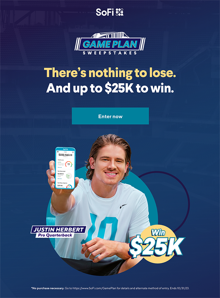 | | We're working with Los Angeles Chargers Quarterback Justin Herbert and SoFi member to help you tackle your ambitions—big or small. There's still time to enter the Game Plan Sweepstakes for a chance to win $25K in cash, or be one of five to score $5K.* | | |