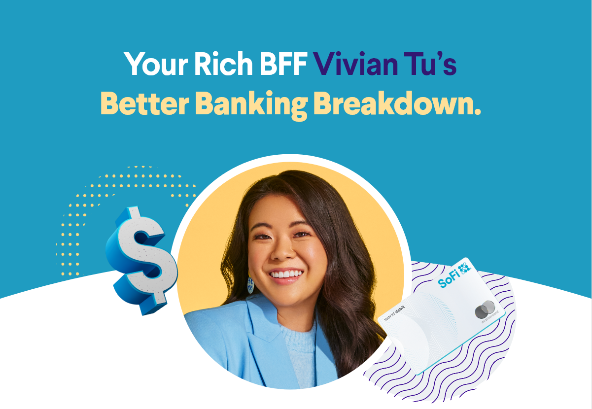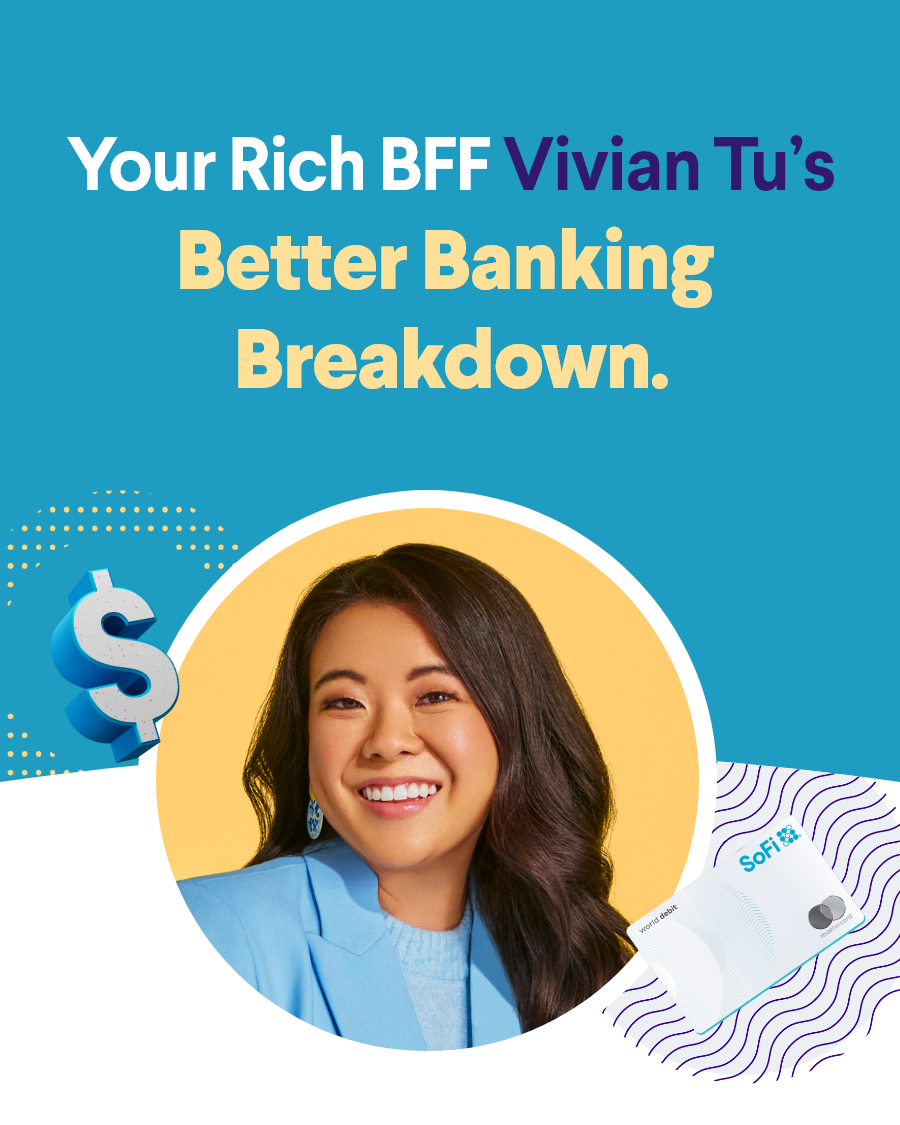 | | Hey Janet—there's a lot to love about SoFi Checking and Savings, but don't just take our word for it. Meet SoFi member Vivian Tu, here today with her Better Banking Breakdown. | | | | Vivian (@YourRichBFF) is an ex-Wall Street trader teaching her followers how to get rich. With her community of over six million followers across the world, she aims to make finance fun and more accessible for the next generation of rich BFFs. | | | | Vivians's fav banking features. | | | | 👇 | | | | Top-notch APY. | | | | "Not only does SoFi offer up to 4.60% APY on my savings*, they also give me 7x the national average on my checking.† I'm earning more interest on my money while it sits in my checking, waiting to be spent on my bills." | | | | | Vaults. | | | | "I use my Vaults to save for upcoming life milestones such as my wedding next year and to potentially buy a car (I am relearning how to drive, LOL)." | | | | |