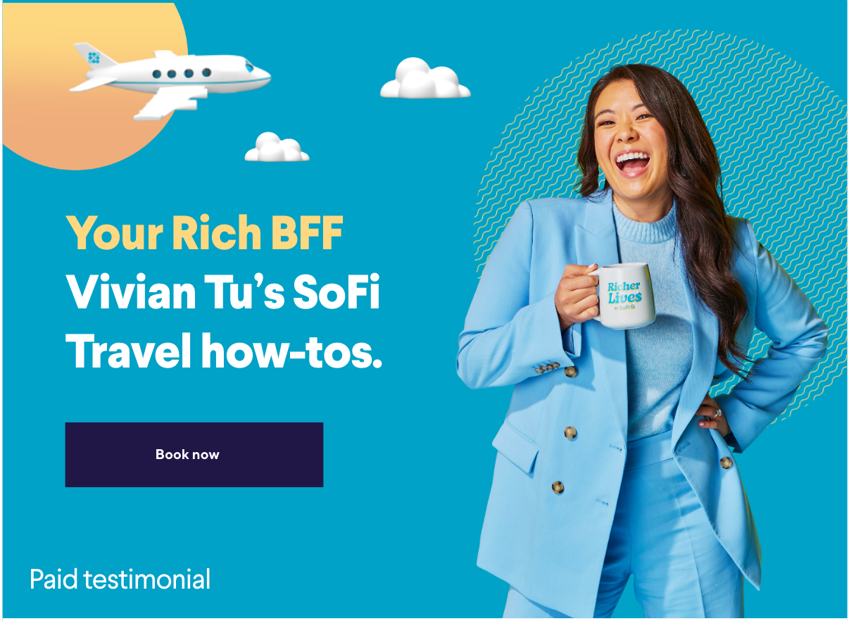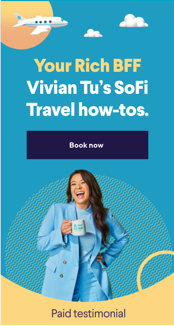| | Janet, let's talk holiday travel savings with Your Rich BFF Vivian Tu's SoFi Travel how-tos. Vivian (@YourRichBFF) is a SoFi member and former Wall Street trader, teaching her followers how to save and get rich. With over six million followers, she's building a community that makes finance fun and approachable for the next generation of Rich BFFs.