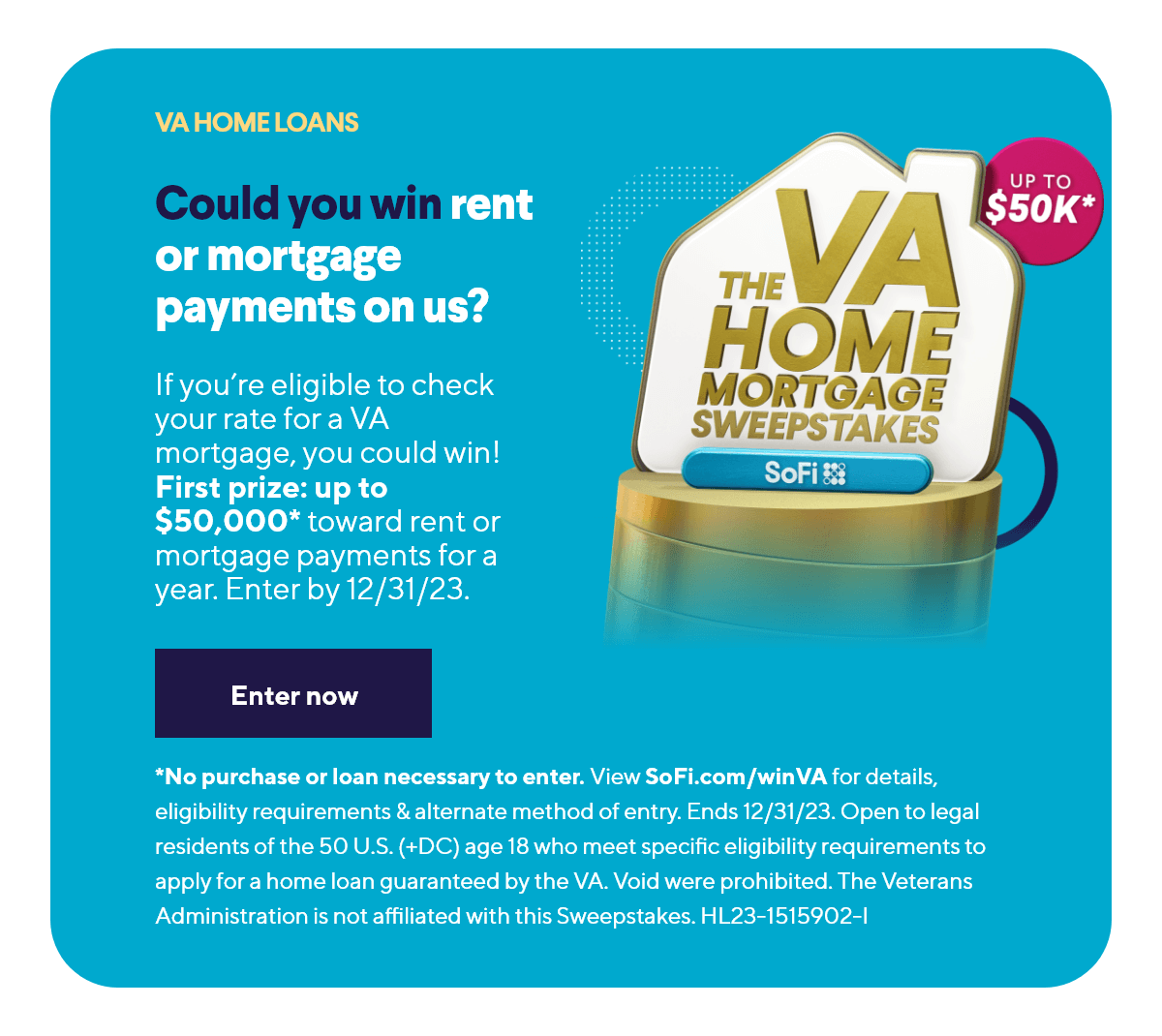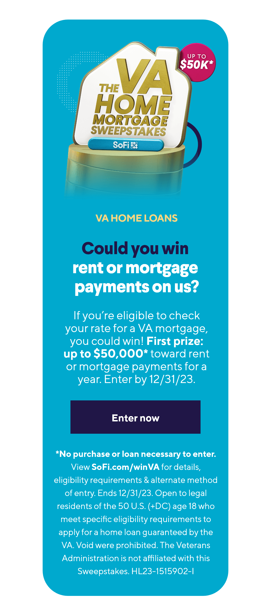 When you're looking for a mortgage, you want a lender that could help you out. Well, SoFi has a few options to give you a hand. | | | | | • | Named the Best Mortgage Lender for Saving Money by CNBC Select in 2023.§ | | • | An award-winning mortgage experience² with dedicated Mortgage Loan Officers. | | • | Experienced in serving over 130,000 homeowners—we're ready to help you, too. | | | | | View your rate today and get $10¹ deposited into your SoFi Checking and Savings account. | | | | ✔ BTW it's a soft inquiry, so it won't affect your credit score.† | | |