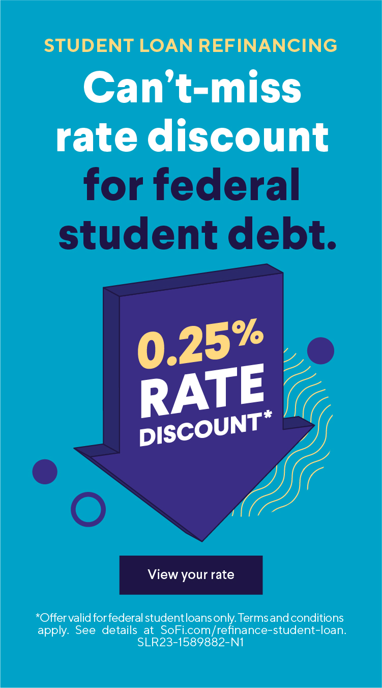 Terms and Conditions Apply. SOFI RESERVES THE RIGHT TO MODIFY OR DISCONTINUE PRODUCTS AND BENEFITS AT ANY TIME WITHOUT NOTICE. To qualify, a borrower must be a U.S. citizen or other eligible status, be residing in the U.S., and meet SoFi's underwriting requirements. Not all borrowers receive the lowest rate. Lowest rates reserved for the most creditworthy borrowers. If approved, your actual rate will be within the range of rates listed above and will depend on a variety of factors, including term of loan, a responsible financial history, years of experience, income and other factors. Rates and Terms are subject to change at anytime without notice and may be subject to other restrictions. You may pay more interest over the life of the loan if you refinance with an extended term. Minimum loan amount of $5,000 unless required to be higher to comply with applicable law. SoFi refinance loans are private loans and do not have the same repayment options that the federal loan program offers, or may become available, such as Income-Based Repayment or Income-Contingent Repayment or PAYE. SoFi Student Loans are originated by SoFi Bank, N.A. Member FDIC. NMLS #696891 (www.nmlsconsumeraccess.org).