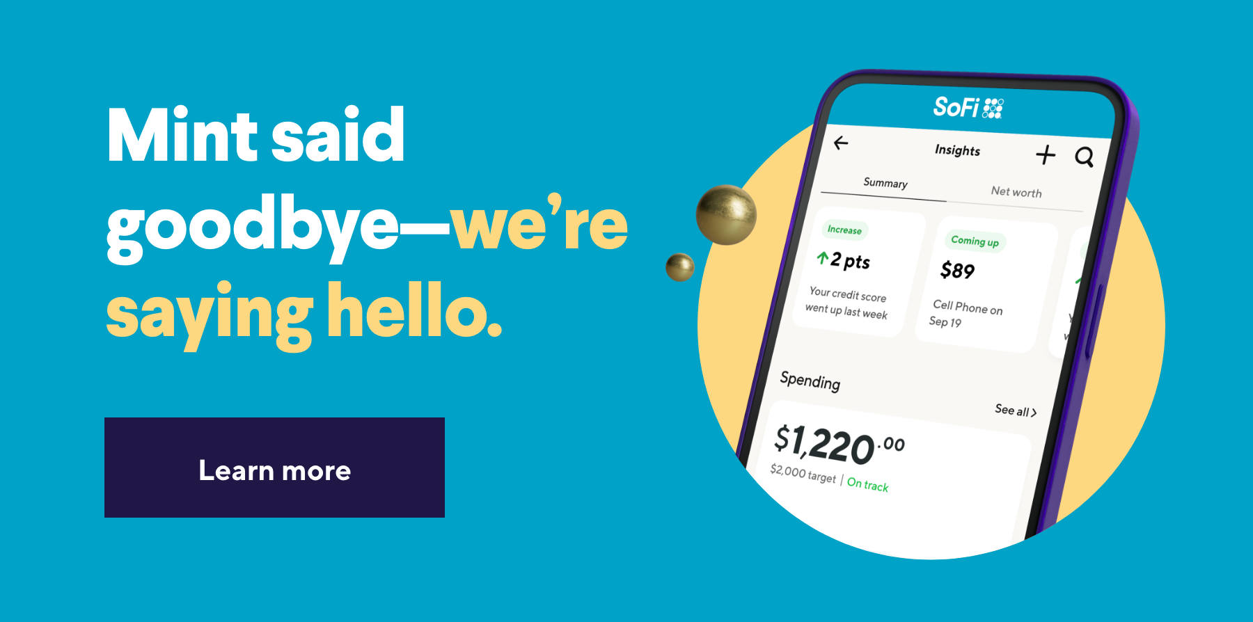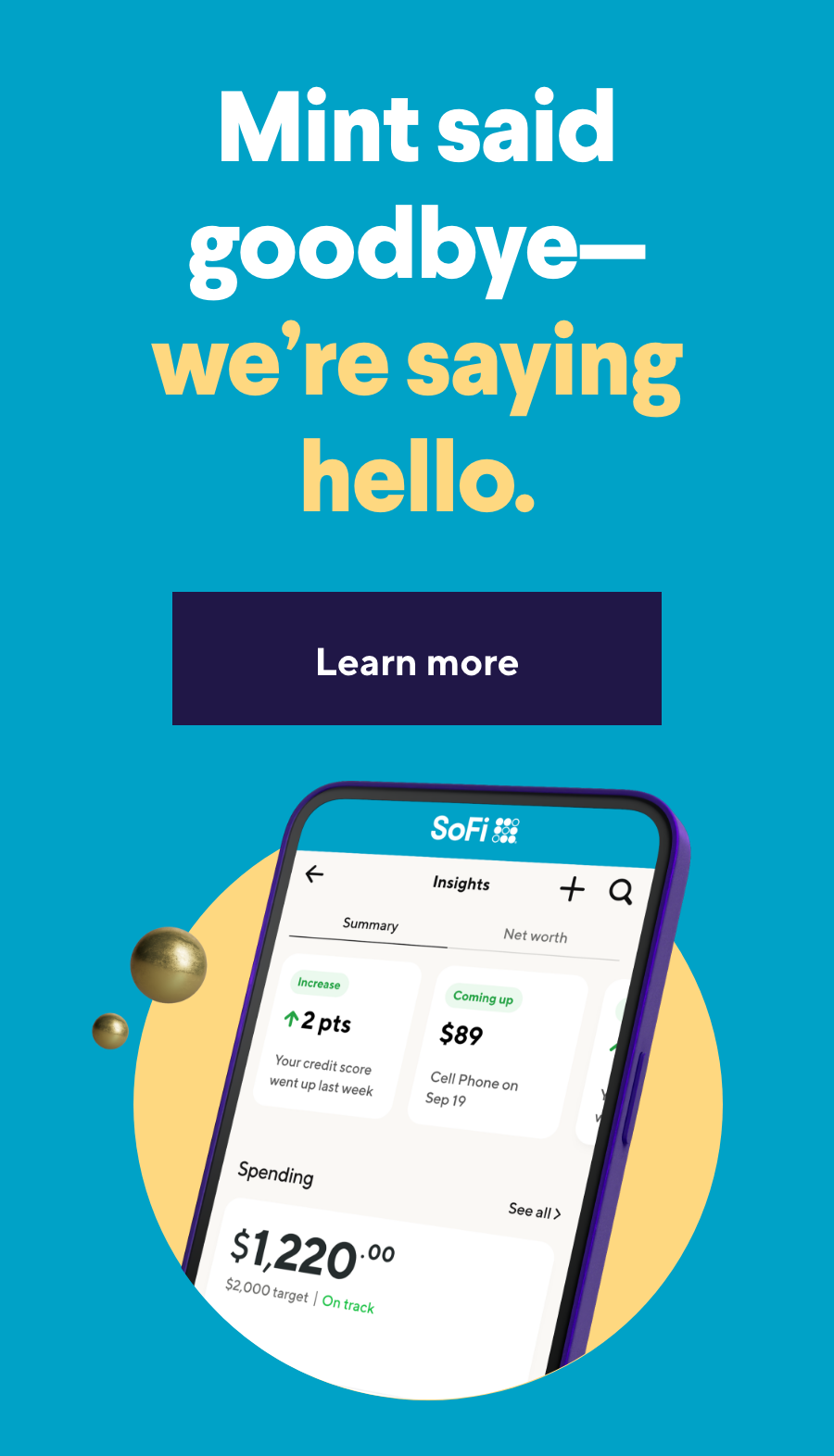 | | Does the latest news have you feeling down? Don't worry—SoFi offers similar features you love and more. Bonus? It's free. | | | | With SoFi, you'll get all the financial management tools you depend on and more. Learn more about SoFi's offerings from net worth tracking and free credit score monitoring to spending insights and more. | | | | SoFi is packed with features and benefits to help you make progress on your finances. Why wait? | | |