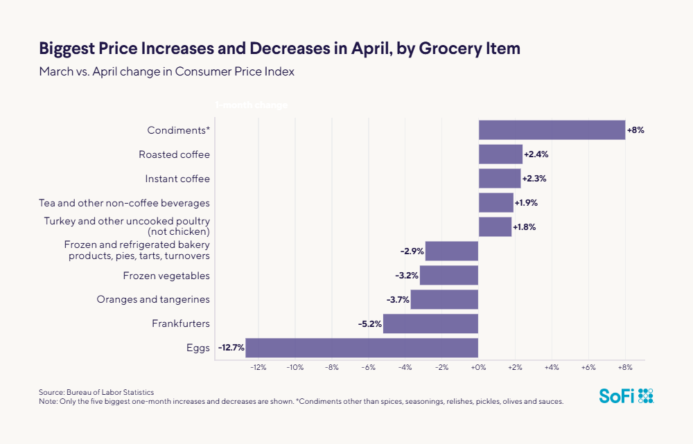 Which prices changed the most? The price of eggs saw the biggest decline, falling almost 13% in April as the impact of bird flu outbreaks waned. They were still 49% pricier than just a year earlier, but moving in the right direction. Hot dogs — or frankfurters, as the Bureau of Labor Statistics calls them — saw the second-biggest drop, followed by oranges, frozen vegetables and frozen/chilled baked goods.