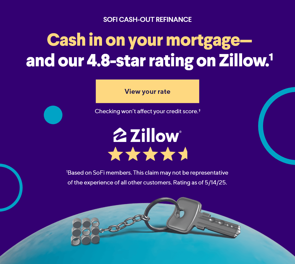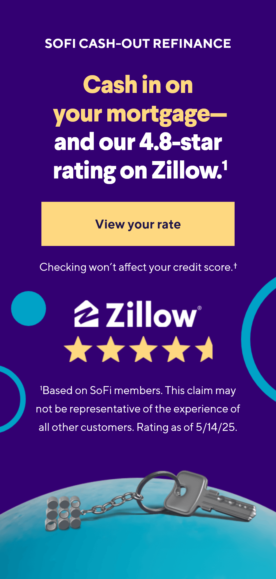 | | Considering a cash-out refi to turn your home equity into usable cash? SoFi Mortgage Loan Officers help make the process as smooth as possible. You could get the cash you need, along with an experience that's earned 4.86 out of 5 stars on Zillow with 1,600+ reviews. You'll talk to a real person and get all the support you need each step of the way, plus: | | | | | • | Get competitive interest rates—and see yours without impacting your credit.† | | • | Enjoy exclusive member benefits, like saving $500 on processing fees² and access to events, helpful advice, and a supportive community. | | • | You could receive a $1,000 cash bonus when you refinance.³ | | | | | Whether you want to pay down high-interest debt, fund renovations, or streamline your bills with one monthly payment, it's time to check out a SoFi cash-out home refinance. | | | | Checking won't affect your credit score.† | | |
