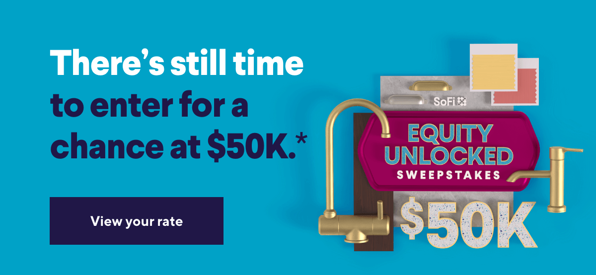 *NO PURCHASE OR QUALIFICATION FOR FINANCING NECESSARY. Open only to legal residents of the 50 US/DC, 18+. Void where prohibited by law. Sweepstakes starts 6/19/25 at 12am PT and ends at 11:59 pm PT on 8/7/25. See Official Rules for free method of entry, prize details, limits, and odds. Sponsor: Social Finance LLC ("SoFi") 234 First Street, San Francisco, CA 94105. | | | | View your rate—you're in. Lock your rate—you're in again. | | | | Janet, a SoFi Home Equity Loan could make it easy to fund your home renovation. The only thing easier: a chance at winning $50,000* in our Equity Unlocked Sweepstakes—now through 8/7/25.