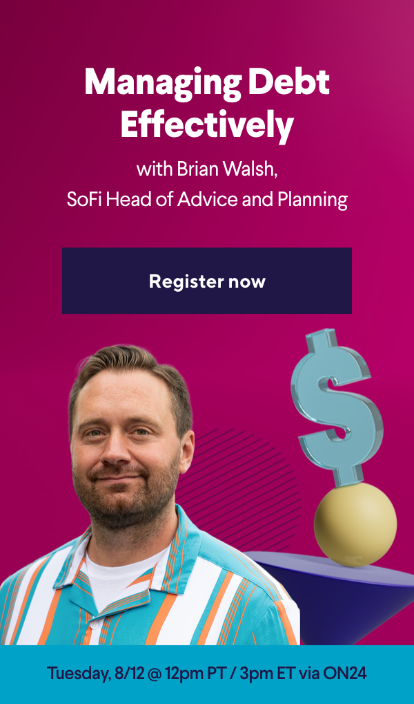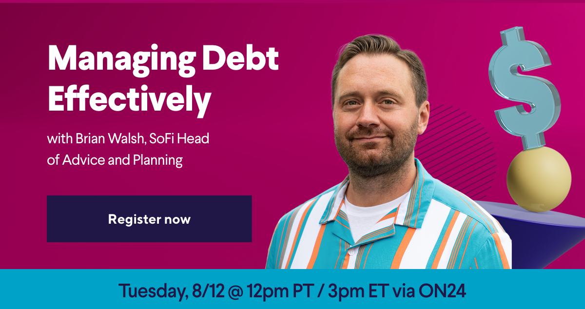 | | | | Ready to take control of your debt? We're here to help. Join Brian Walsh, SoFi's Head of Advice and Planning, for a webinar to help you take actionable steps toward managing your debt.