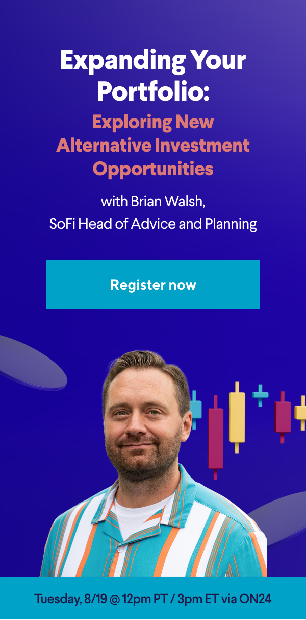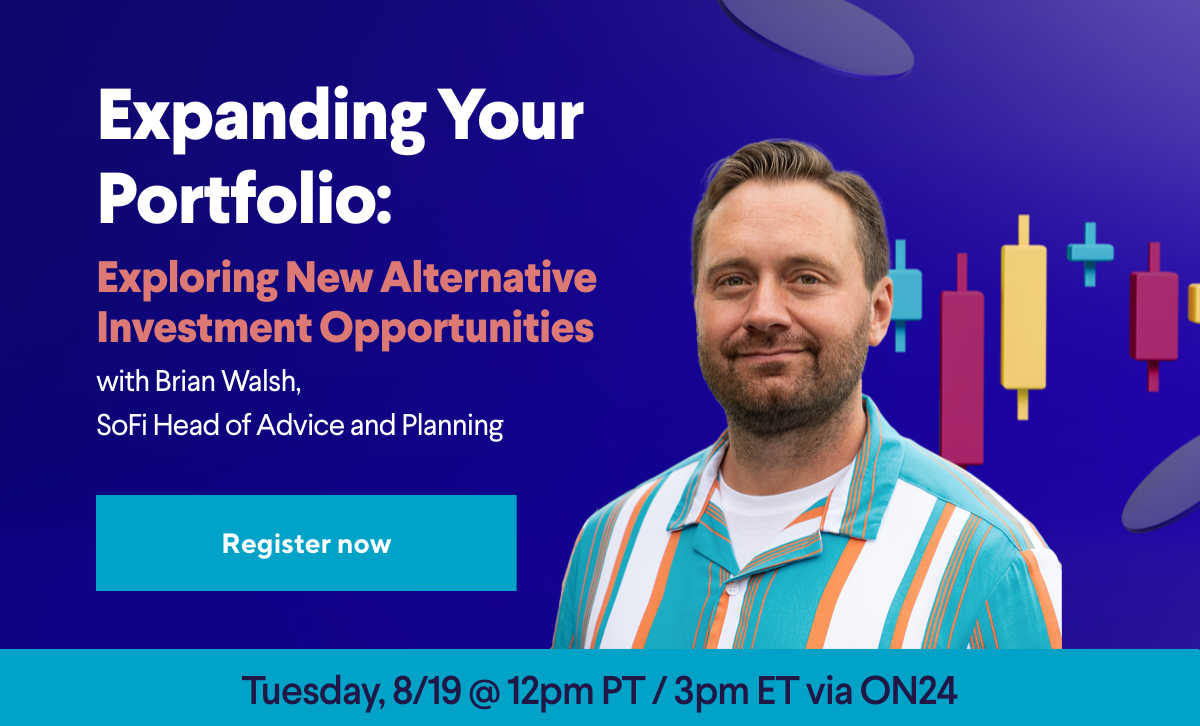 | | | | Take your portfolio beyond stocks and bonds. Join SoFi's Brian Walsh, Head of Advice and Planning, for a webinar all about alternative investments.
