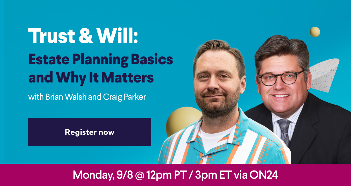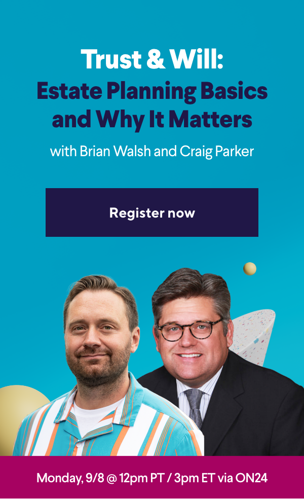 Join SoFi's Head of Advice and Planning Brian Walsh and Trust & Will's Assistant General Counsel Craig Parker to learn the key components of an estate plan, the difference between a trust and a will, and everything you need to know to take a meaningful step toward helping to protect your future. | | | Brian Walsh is a Registered Representative of SoFi Securities, LLC and an Investment Adviser Representative of SoFi Wealth, LLC. | Craig Parker is not an employee of SoFi and is not being compensated for his appearance. The views expressed are of Trust & Will and may not be representative of SoFi.