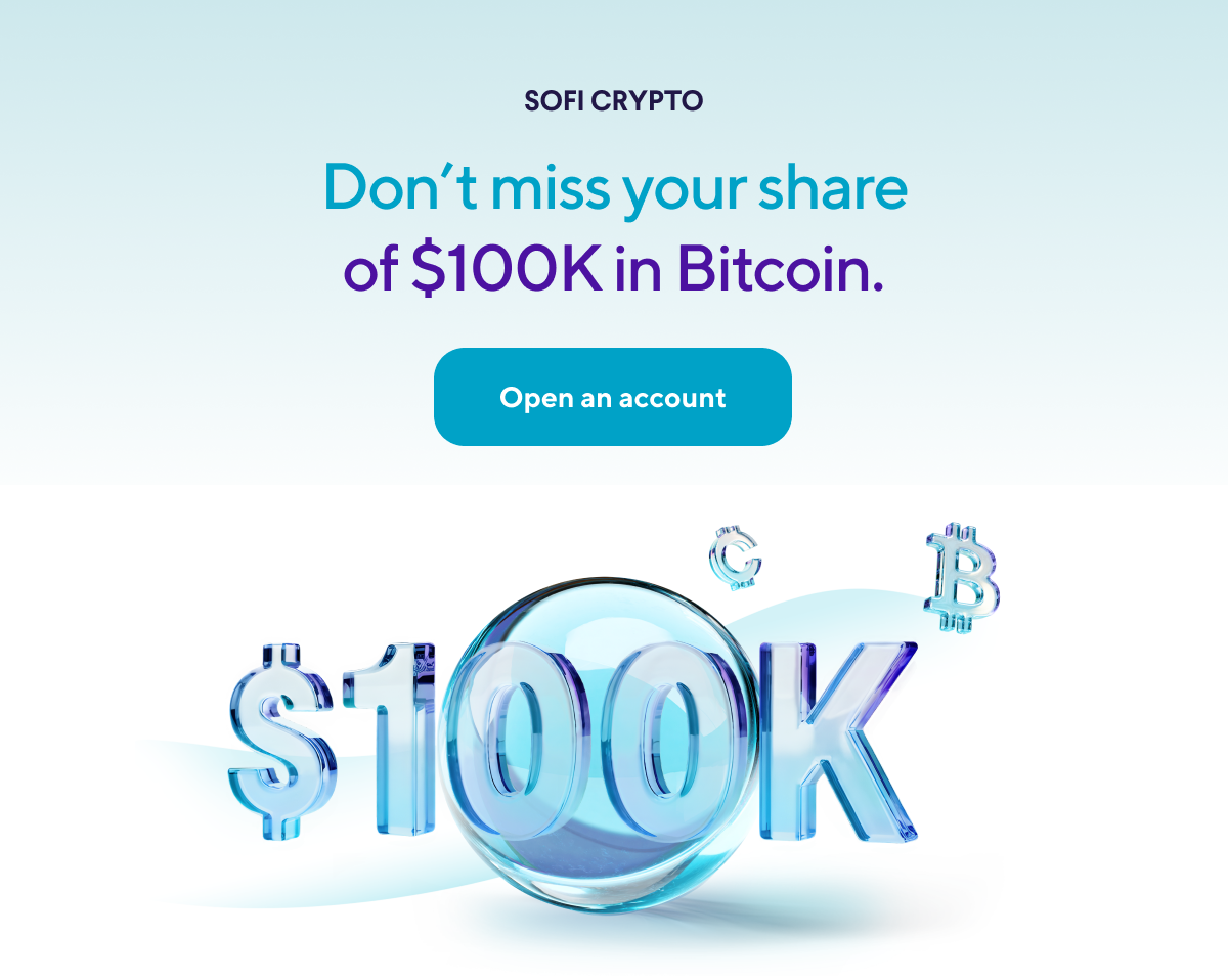 | | Janet, remember to open a SoFi Crypto account this week to get your piece of the $100,000 in Bitcoin we're giving away to new members.* Learn more about SoFi Crypto.