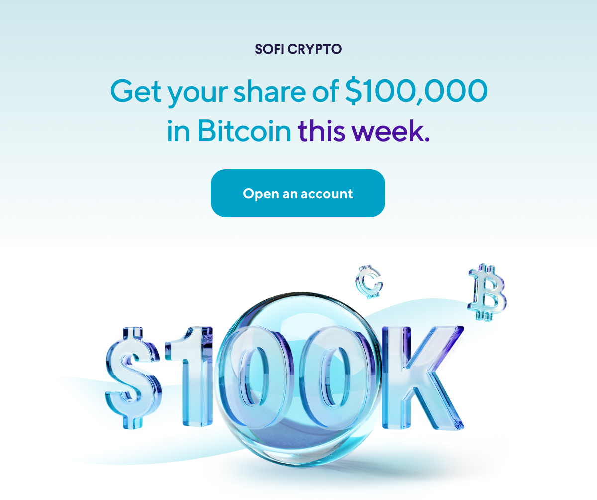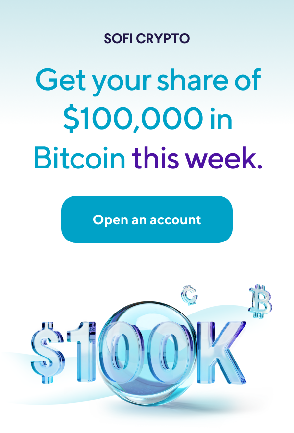 | | Don't miss the SoFi Crypto $100K Promo. | | | | Hey, Janet— when you open a SoFi Crypto account this week, you'll split $100,000 in Bitcoin with all our other new members this week. In fact, we're giving away $100K in Bitcoin every week through March 31, 2026.* Learn more about SoFi Crypto. | | | | All totaled, that's $600,000 in Bitcoin put in the hands of members just for giving SoFi Crypto a try. Not too shabby. A crypto community for everyone. See how SoFi stands out on a platform with bank-grade safeguards. Purchase crypto instantly using your SoFi Checking and Savings—so you can trade the moment you're ready, and earn a high APY with an FDIC-insured bank account when you're not. There's no better way to try out crypto than with some Bitcoin on us. So don't wait. | | |