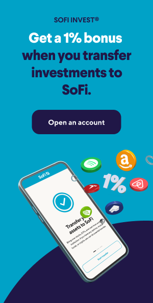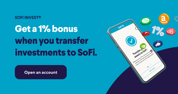 | | Goodbyes can be hard, but we're guessing a 1% cash bonus on your investments when you invest your portfolio to SoFi* might help dry any tears. Open a SoFi Self-directed account to get started. Offer ends 3/31/26. Why transfer to SoFi Invest? All-in-one investing. Trade stocks, ETFs, and options, access alt investments, get the opportunity to participate in IPOs, or save for retirement—all in one easy-to-use app. Investing involves risk. Financial planning. Get a one-time, 30-minute session with a SoFi Financial Planner to help you build your portfolio. Invest with as little as $5. Buy a piece of your favorite company for as little as $5 with fractional shares. Restrictions may apply. | | | | For a complete list of SoFi Invest promotions currently live, please visit here. *SoFi will match 1% of a customer's ACAT transfers, up to $5,000,000 into an existing or newly opened SoFi self-directed individual retirement account (IRA) or taxable account during the Offer Period of March 12, 2026 – March 31, 2026. The transferred assets must be settled before the end of the Offer Period to qualify for the match. For the full terms and conditions, please visit SoFi.com/ACATterms. | | |