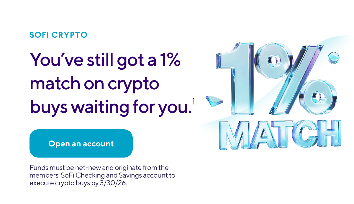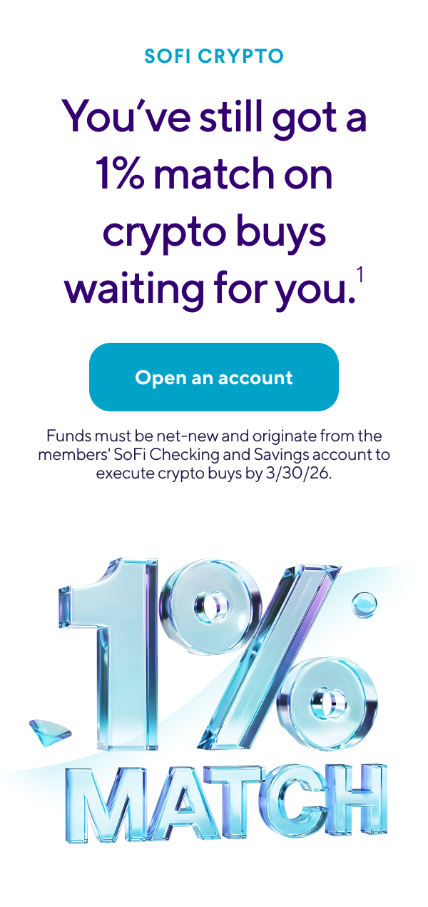 Through 3/30/26, you can earn a 1% match on crypto buys.1 Open a SoFi Crypto account to get started. And that's not the only good thing about going with SoFi for crypto... | | | | | • | It's the first national chartered bank where retail customers can own crypto—and bank, borrow, and invest—all in one app. | | • | You'll get a platform with bank–level safeguards—including regulation and custody standards—now for crypto. | | • | Get education and in–app guidance to help you feel confident every step of the way. | | • | Instantly move money from your SoFi Bank to SoFi Crypto account, so you can trade the moment you're ready. | | | | | Want to learn more before you get started? Get more info on how crypto at SoFi works right here. | | | | Funds must be net-new and originate from the members' SoFi Checking and Savings account to execute crypto buys by 3/30/26. | | |