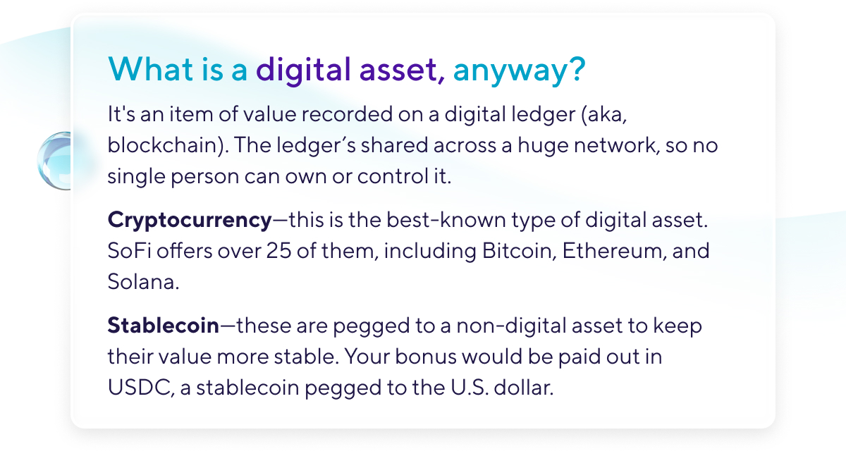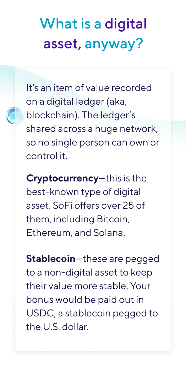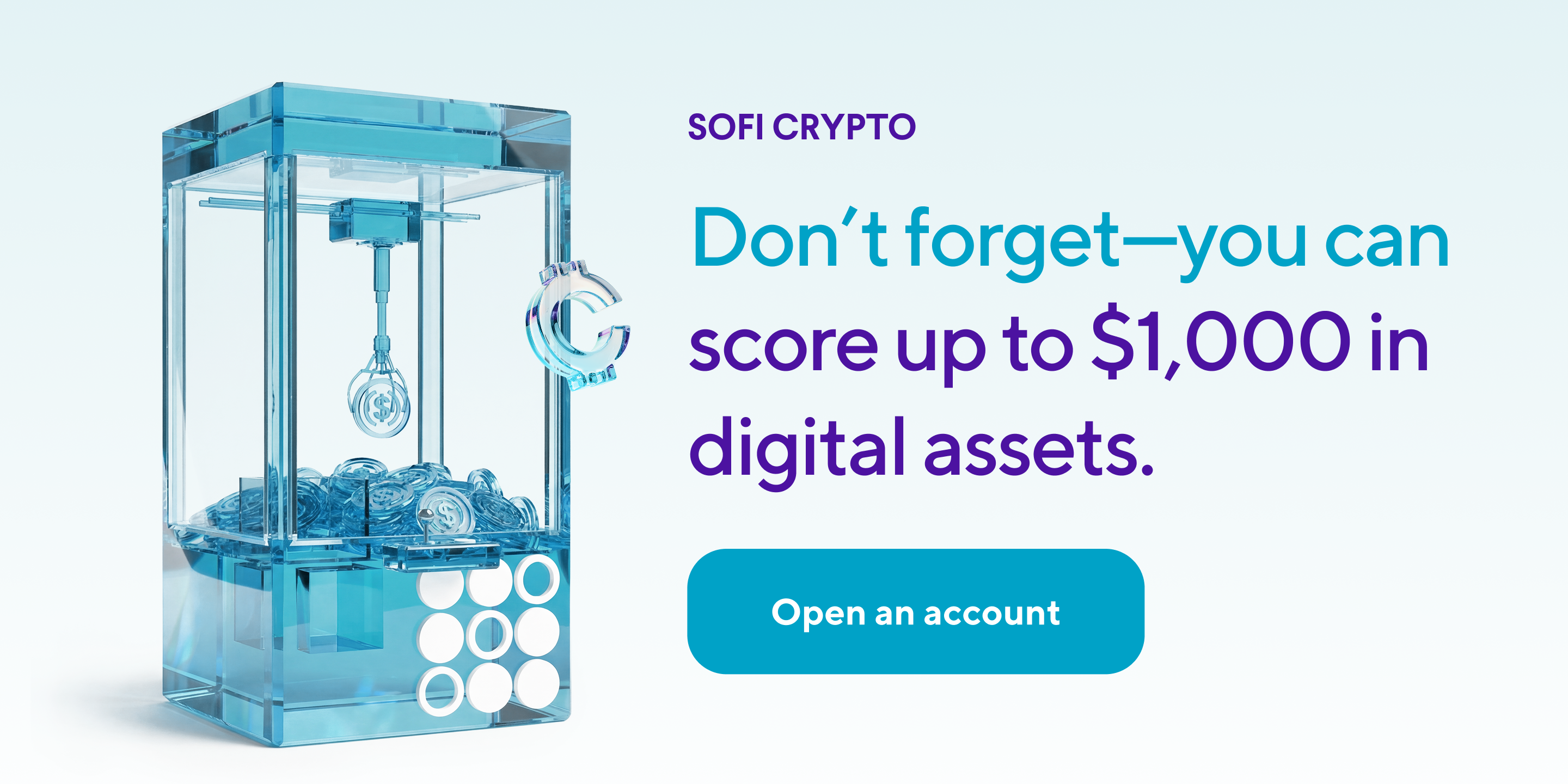 *Offer valid from 4/3/26 through 6/30/26 for New SoFi Crypto Members Only. Rewards are randomly assigned in amounts of $5, $10, $25, $100, or $1000. Higher-value rewards are less likely; most recipients receive $5 in digital asset award. Odds vary based on eligible participants and reward allocation. See full terms and conditions at https://www.sofi.com/crypto/clawpromotion/rules. SoFi Crypto products and services are offered by SoFi Bank, N.A., a national bank regulated by the Office of the Comptroller of the Currency. |
